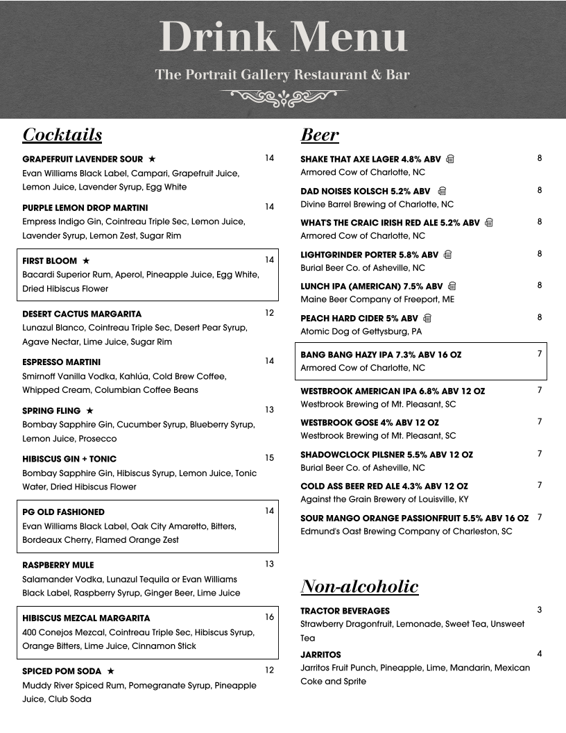 “ We had the best meal at The Portrait Gallery last weekend. The service was prompt and friendly, the drinks were amazing, and the food was awesome. I definitely recommend to anyone who wants to try local or a more intimate setting for date night, brunch, or a small plate at the bar. ”