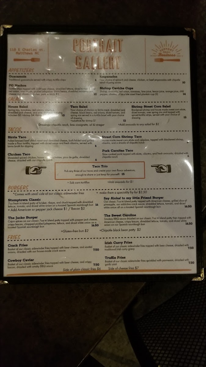 The Portrait Gallery Restaurant is a hidden gem in the heart of Matthews, NC. Nestled at 118 E Charles St, this eatery offers a warm and inviting atmosphere perfect for any occasion—from intimate date nights to celebratory gatherings. The restaurant prides itself on a diverse menu, featuring delightful starters like Brussels sprouts and Burrata Caprese, alongside main courses such as the pan-seared salmon and blackened shrimp Alfredo. With an extensive selection of crafted cocktails and decadent desserts, each dish reflects a commitment to quality and flavor. Patrons rave about the attentive service and beautifully designed spaces, making every visit memorable.